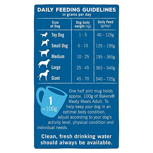 Daily Feeding Guide Size of Dog: Toy Dog 1 - 5 kg, Daily Feed: 35 - 115 (grams per day) Size of Dog: Small Dog 5 - 10 kg, Daily Feed: 115 - 190 (grams per day) Size of Dog: Medium 10 - 25 kg, Daily Feed: 190 - 380 (grams per day) Size of Dog: Large 25 - 45 kg, Daily Feed: 380 - 590 (grams per day) Size of Dog: Giant 45 - 70 kg, Daily Feed: 590 - 820 (grams per day) One half pint mug holds approximately 100g of Bakers Complete®. The recommended daily amounts should be adjusted according to weather conditions, the animal's level of activity and its physical condition. Individual needs vary and feeding should be adjusted as required to help maintain your dog at a lean, healthy body weight. Clean, fresh drinking water should always be available