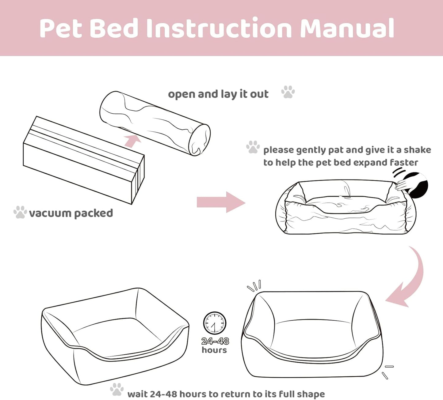Higher quality PP cotton is used to make the pet bed softer and fluffier. Since it is vacuum packed, need to wait 24-48 hours to return to its full shape. Please gently pat and pull to help the cat bed expand faster