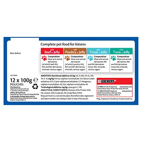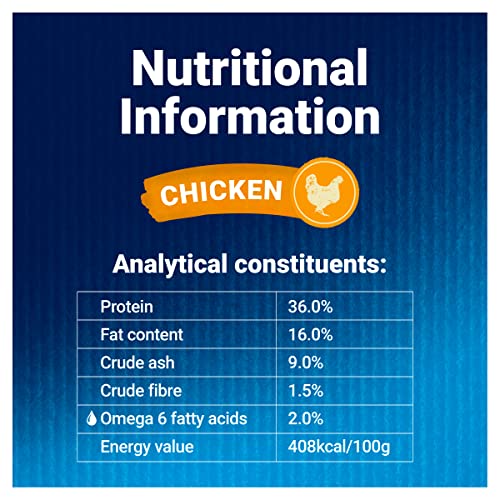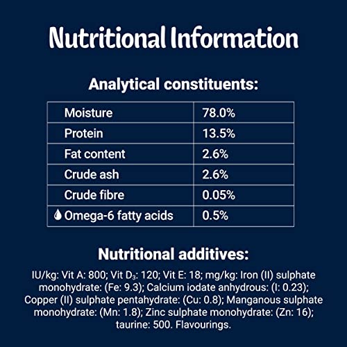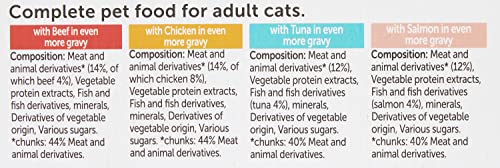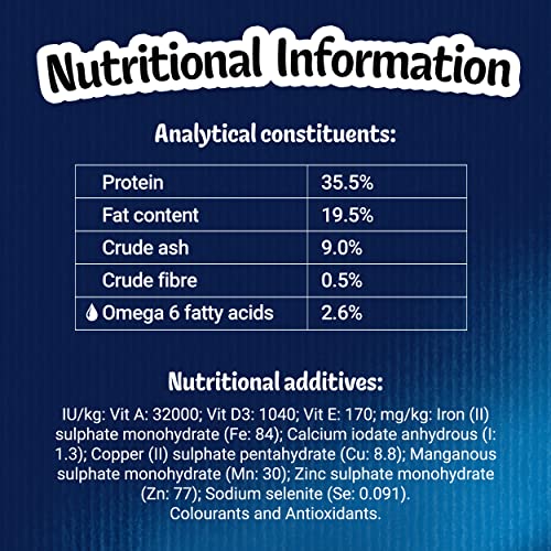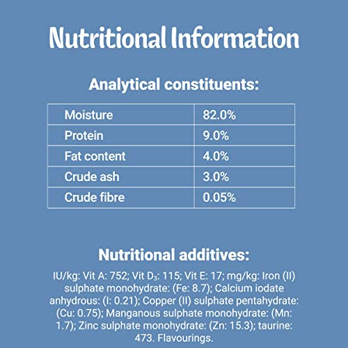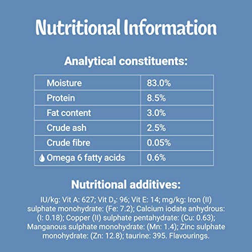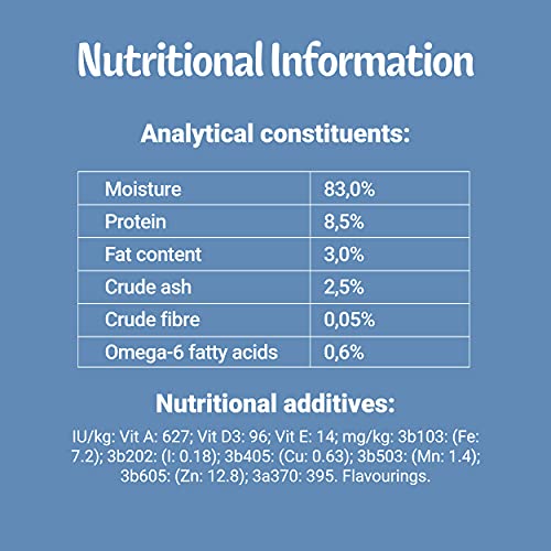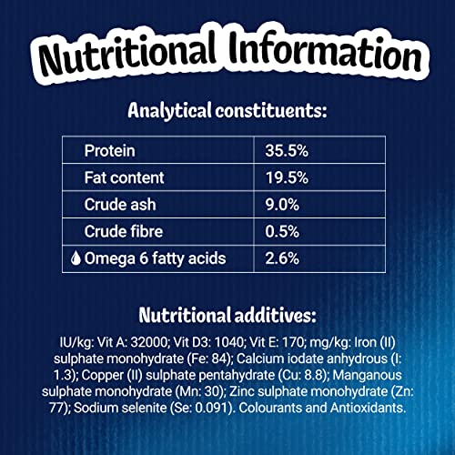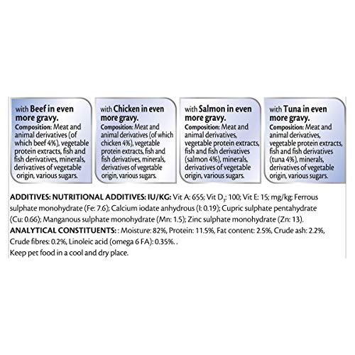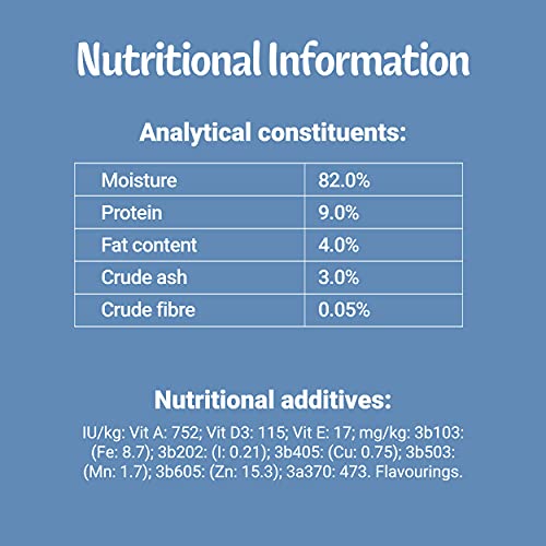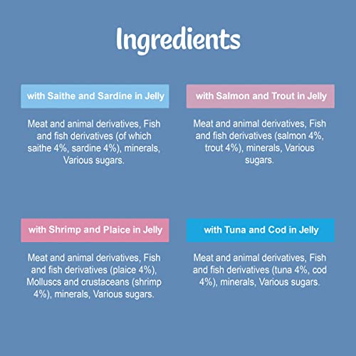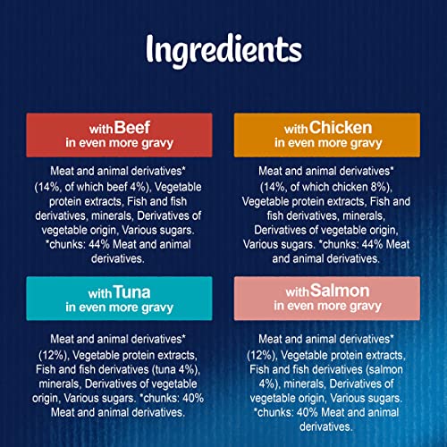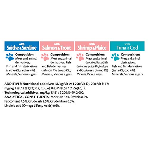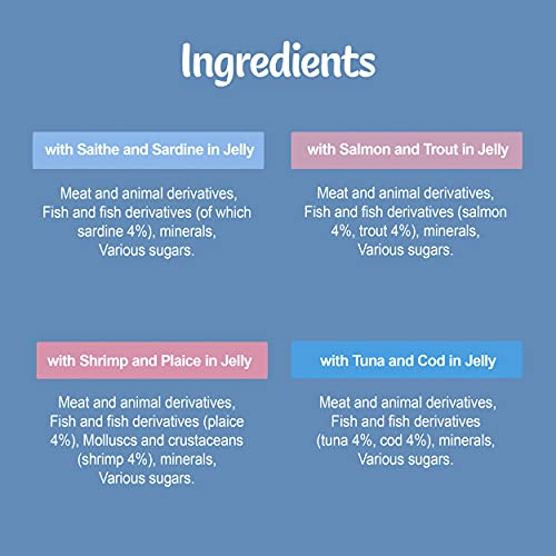 Meat and animal derivatives (of which beef/chicken/turkey min 4%); fish and fish derivatives (salmon min 4%); minerals; various sugars.