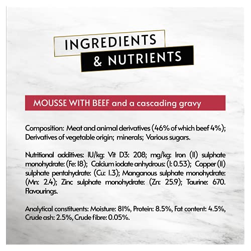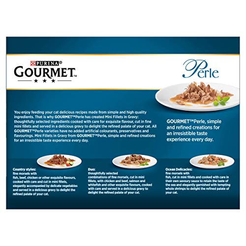 Product Description You enjoy feeding your cat delicious recipes made from simple and high quality ingredients. That is why GOURMET Perle has created Mini Fillets in Gravy: thoughtfully selected ingredients cooked with care for exquisite flavour, cut in fine mini fillets and served in a delicious gravy to delight the refined palate of your cat. All GOURMET Perle varieties have no added artificial colorants, preservatives and flavourings. Mini Fillets in Gravy from GOURMET Perle, simple and refined creations for an irresistible taste experience every day. Directions For an average adult cat (4kg), feed 3 to 4 pouches per day in at least 2 separate meals. The adult maintenance averages are based on moderately active cats normal environmental temperatures. Individual needs vary and feeding should be adjusted as required to maintain your cat at a lean, healthy body weight. Serve at room temperature. Clean, fresh drinking water should always be available. Safety Warning The pouches are not toys. To avoid suffocation, keep out of reach of children and pets. Manufacturer Contact Information Purina PetCare Team, PO Box 478, Horley, RH6 8DE.