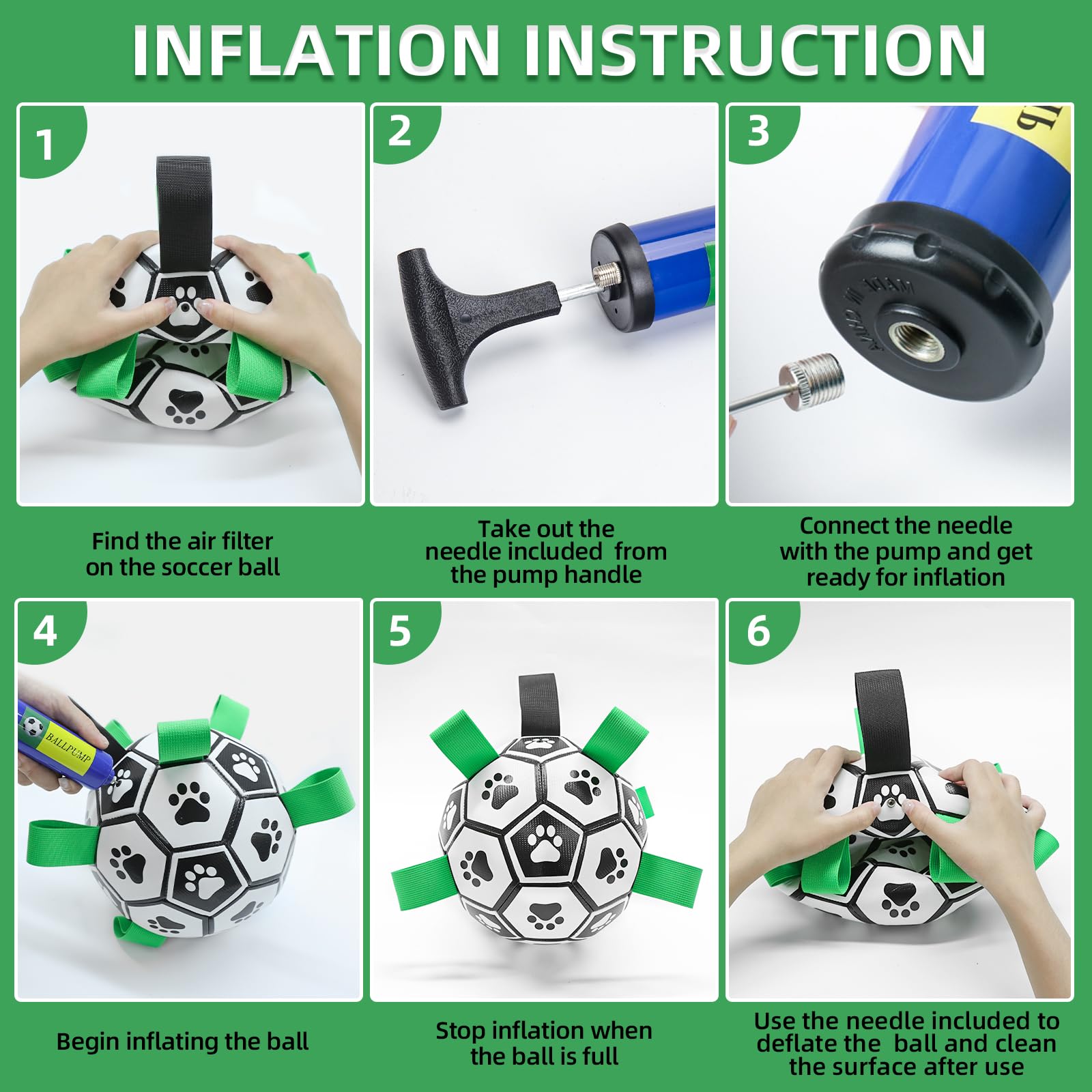 - 🐶WHAT YOU GET: There have a needle point adapter, a pump and a dog football. The football will arrive in an uninflated state, please refer to the instruction manual and use the inflator provided in the package. It is easy and safe to operate.