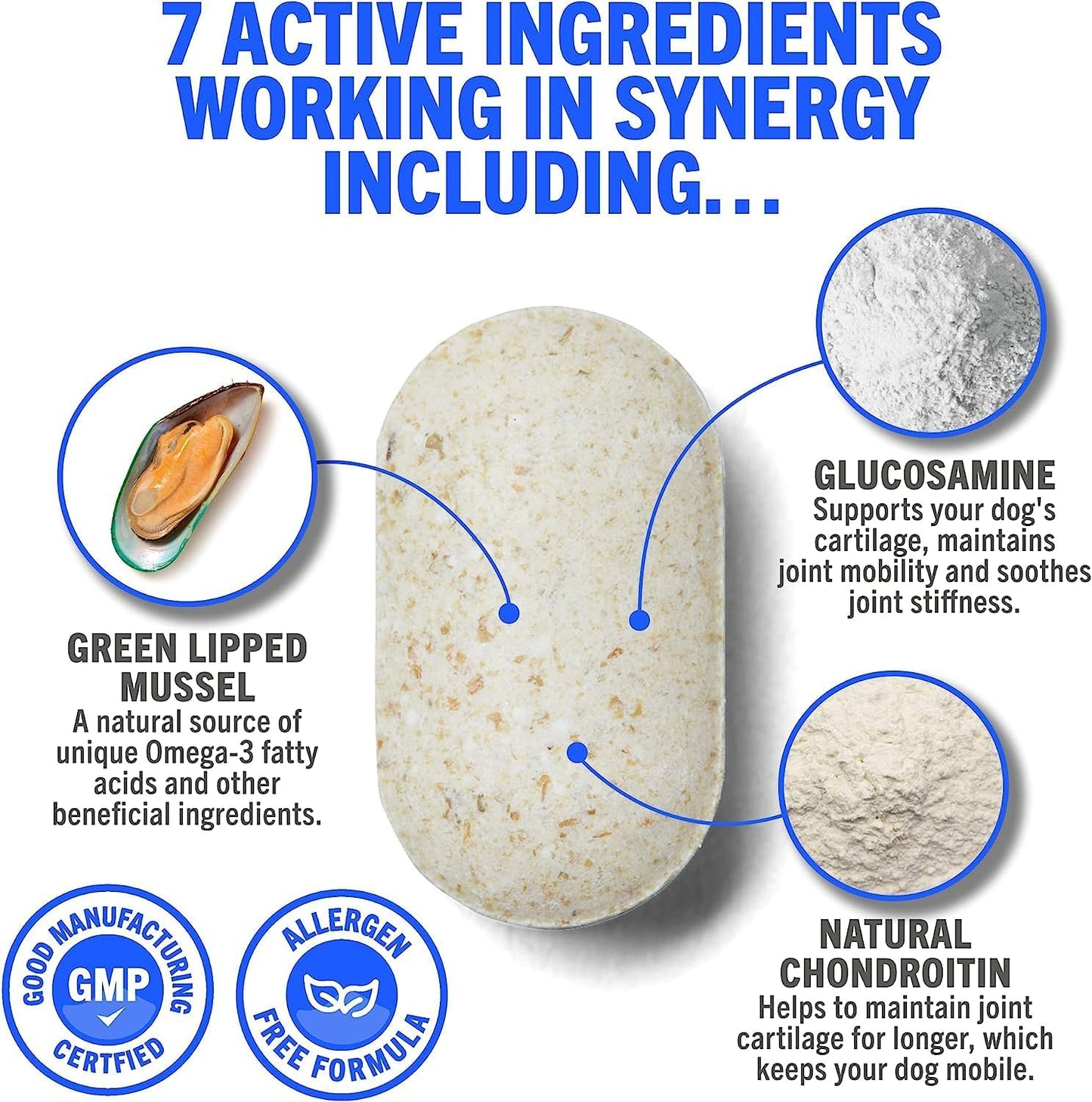 🐶 7 ACTIVE INGREDIENTS: Green Lipped Mussel, Glucosamine, Natural Chondroitin, Vitamins C and E, Manganese & Hyaluronic Acid.