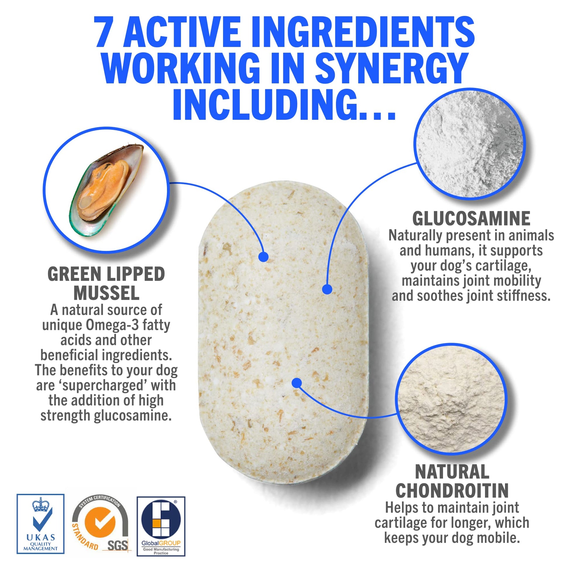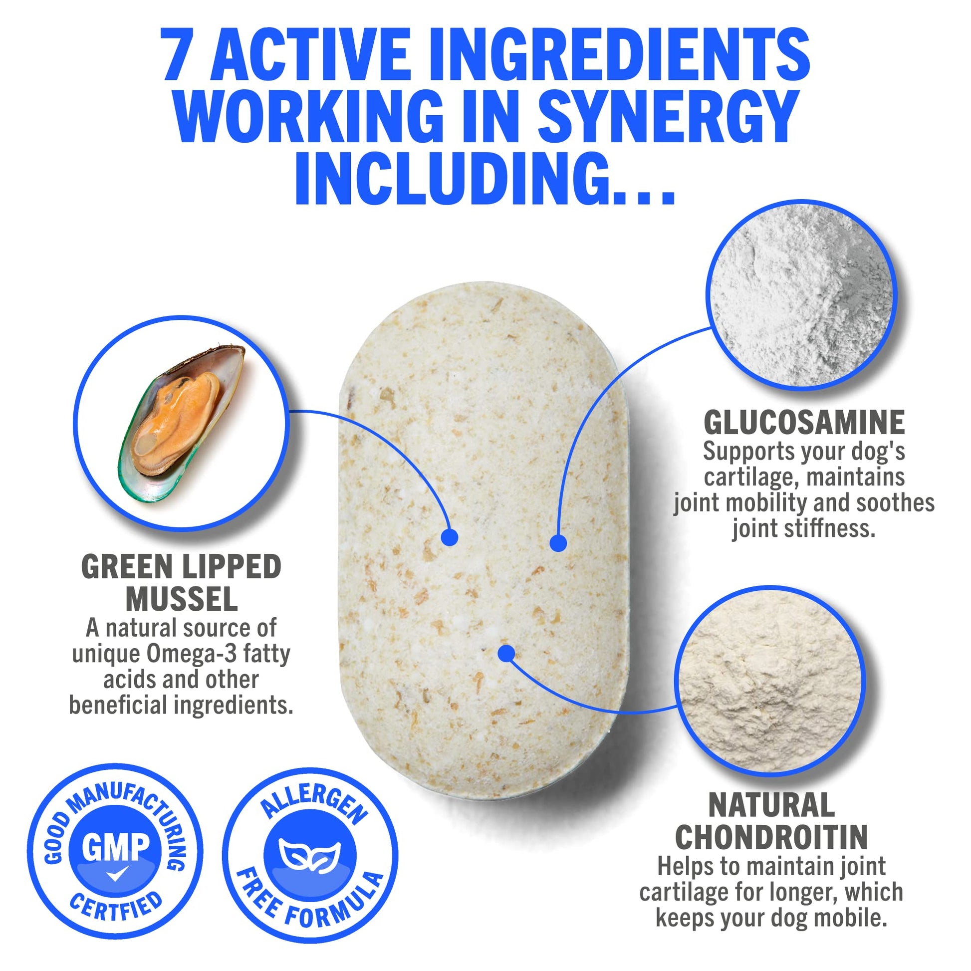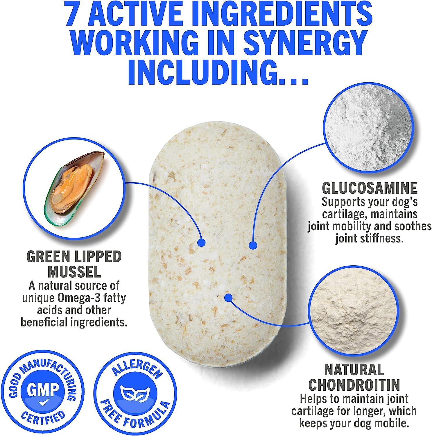 - š¶ 7 ACTIVE INGREDIENTS: Green Lipped Mussel, Glucosamine, Natural Chondroitin, Vitamins C and E, Manganese & Hyaluronic Acid. Formulated to treat stiffness while supporting & maintaining normal joint function.