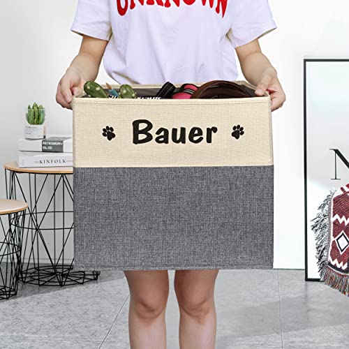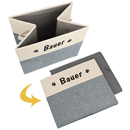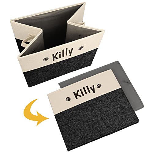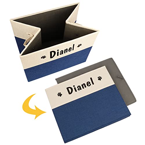- 【PERSONZLIZED CUTE UPGRADED DESIGNS】 This cute design dog toy box stands upright,convenient for put in or get toys out,it`s folded when needed. With 2 handles on each side,the dog toys basket can be moved easily.This toy box can be customized with name with paw prints;