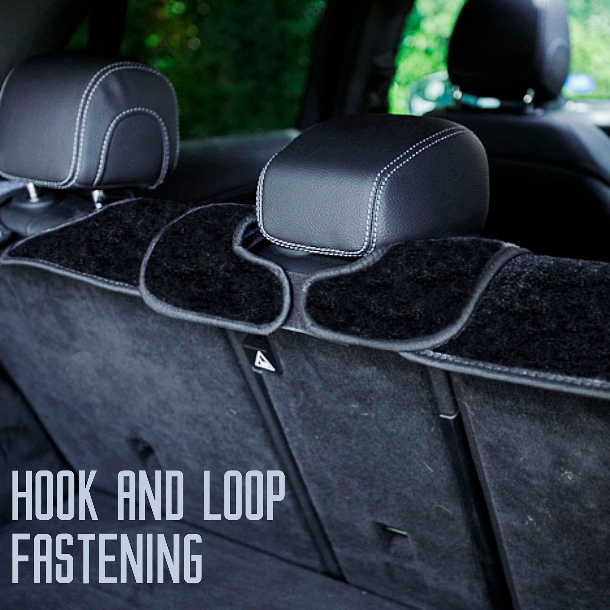 - EASY TO CLEAN AND INSTALL - Takes just a couple of seconds to fit or remove! It simply hooks around the head rest and held in place by Velcro it even makes allowances for the seat belt clips. The cover can be removed and machine washed to help reduce dog odour in your car.