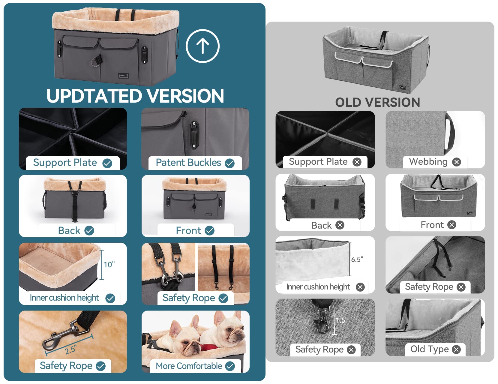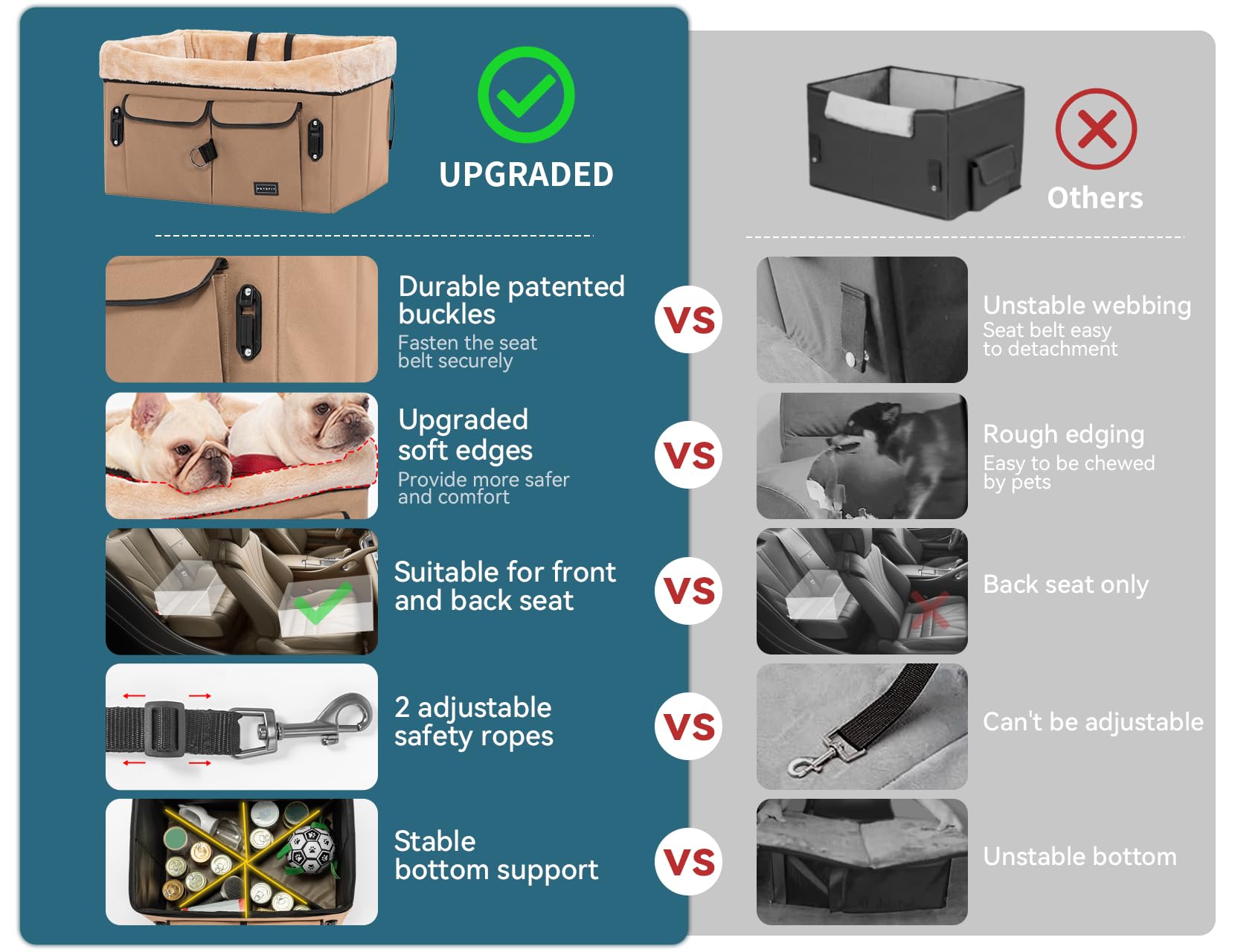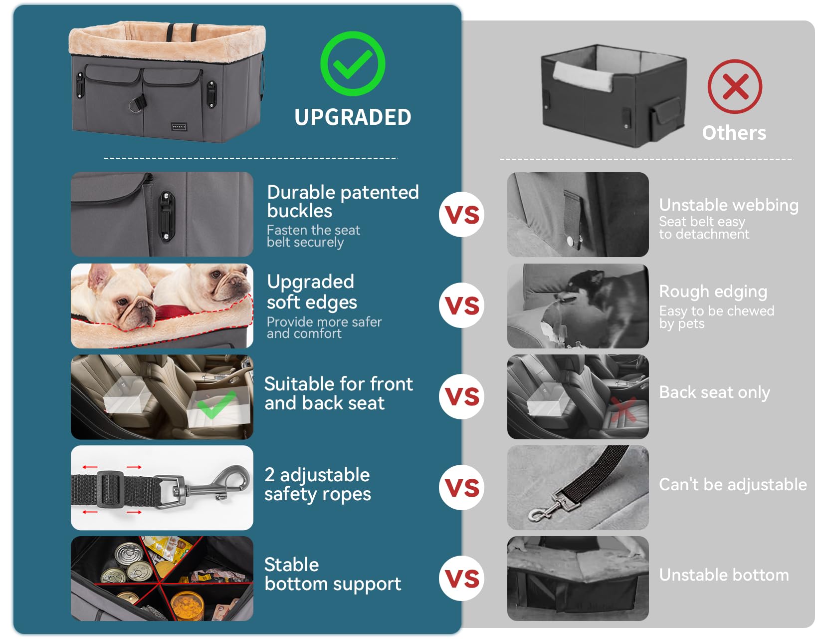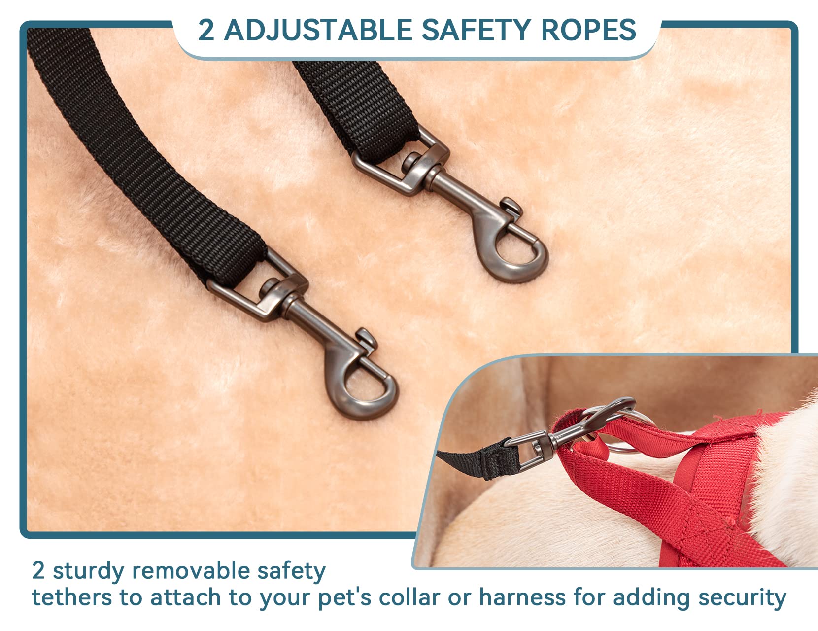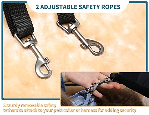 - [Lower Distracted Driving] The dog booster seat is designed with an adjustable lanyard, a safety clip, and 2 patent buckles to secure the seat and keep it from sliding in the car. And come with 2 upgraded bigger safety ropes to avoid pets jumping out, It lessens the likelihood that you will become distracted while driving.