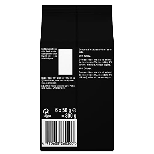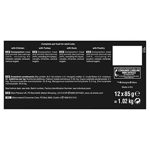 Feeding instructions: Allow a transition phase and adjust amounts according to your pet's needs. For overweight cats reduce daily amount. How? Visit our website or call our Consumer Careline. 24h Daily Feeding Recommendation Pouch Only: 3 kg 2 1/2, Pouch + Dry Food: 2 + 15 g Pouch Only: 4 kg 3 1/2, Pouch + Dry Food: 2 + 20 g Pouch Only: 5 kg 4, Pouch + Dry Food: 2 1/2 + 25 g We recommend to feed a mix of Sheba® wet and dry food. Fresh water should always be available. Serve at room temperature, surplus food can be refrigerated for up to 2 days. 62 kcal/85g