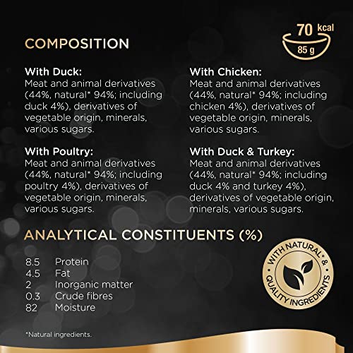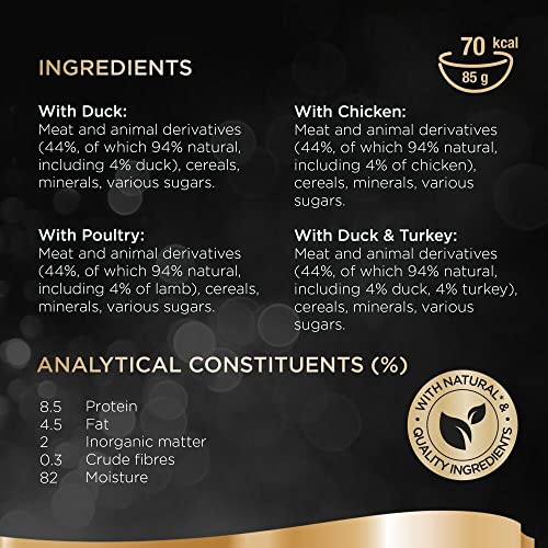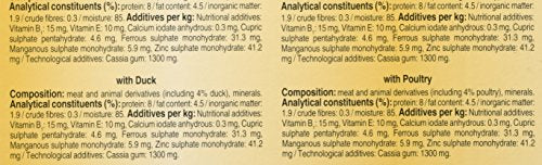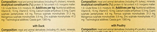 With Duck: Meat and animal derivatives (45 percent including 4 percent duck), minerals, and various sugars.