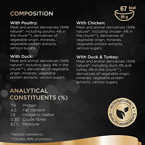 Multipack with 4 exquisite varieties: chicken, duck, turkey and poultry pouches in a delicious gravy sauce / Without artificial colours or preservatives